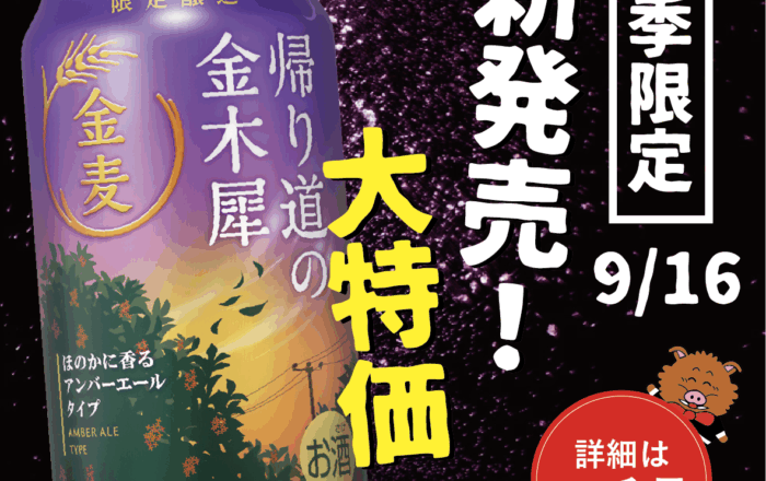 今年もあの季節がやってきました。キンモクセイの甘く爽やかな香りが風に乗り、家路につく時間を特別にしてくれる。そんな幸せな瞬間を表現した「金麦〈帰り道の金木犀〉」が、酒のスーパーやまもと各店舗で販売を開始いたしました!