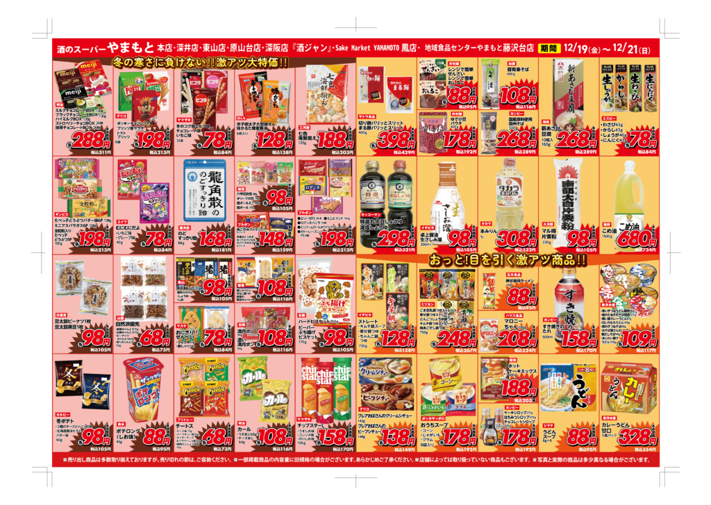 12月19日(金)から12月21日(日)の3日間限定、その名も「年末大特売!ド迫力の大還元祭!!」「地域密着度No1」を目指す私たちだからこそ実現できた、バイヤー渾身の「超衝撃価格」が店内を埋め尽くします! 「やっぱりやまもとは安い!」と皆様に喜んでいただけること間違いなしの3日間です。