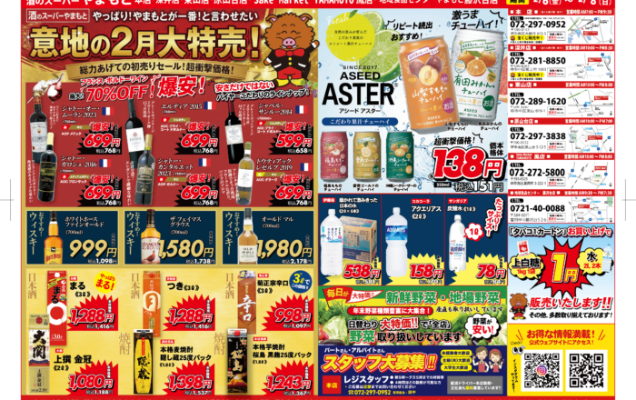 地域の皆様に愛されてこその「酒のスーパーやまもと」です。 「どこよりも安く、良いものをお届けしたい」という商売人の“意地”にかけて、総力をあげた大セールを開催いたします。