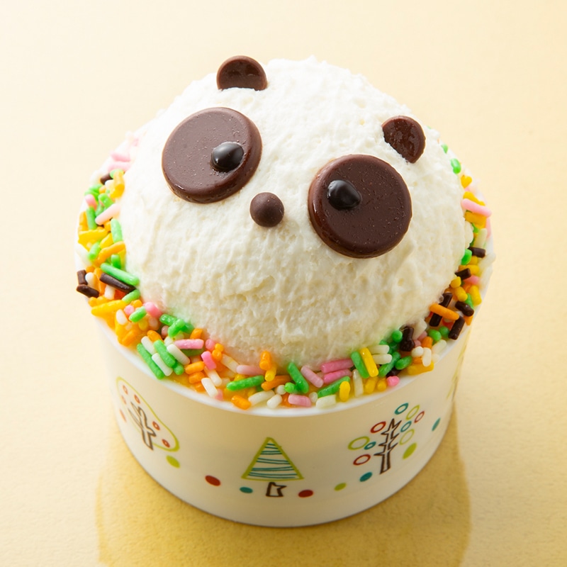 パンダをイメージしたとっても可愛らしいスイーツです。ホワイトチョコクリームで包まれた丸いフォルムに、チョコチップをちりばめて、さらにホイップクリームとシリアル入りチョコで愛らしいパンダの顔をデコレーションしました。しっとりとしたスポンジとミルク感たっぷりのホイップクリームが相性抜群!やさしい甘さのホワイトチョコクリームに、チョコチップの食感がアクセントになり、見た目も味も楽しめる一品です。お子様にも安心してお召し上がりいただけます。