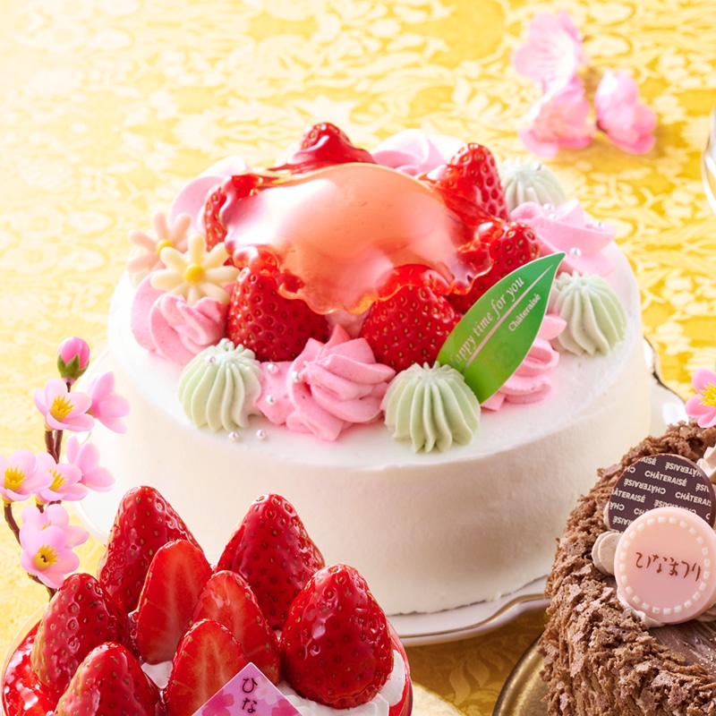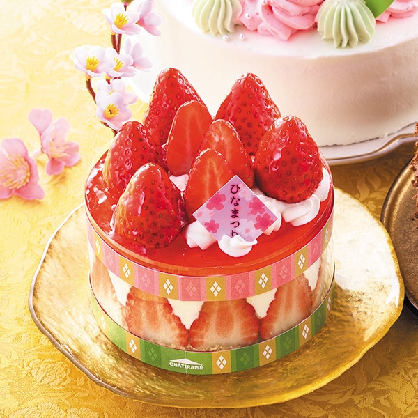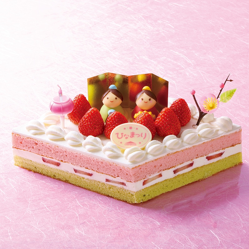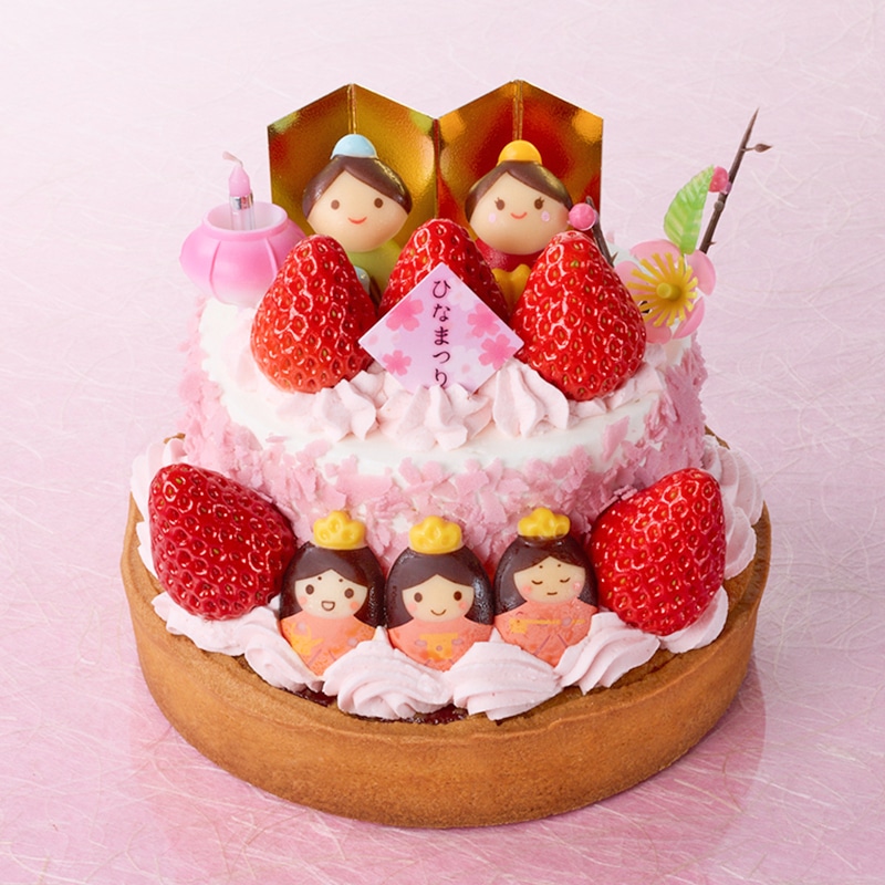 しっとりと口溶けのよいスポンジでホイップクリームと苺をサンドし、天面には苺やチョコレートの雛人形、桃の花、ぼんぼりを色鮮やかに飾り付けました。