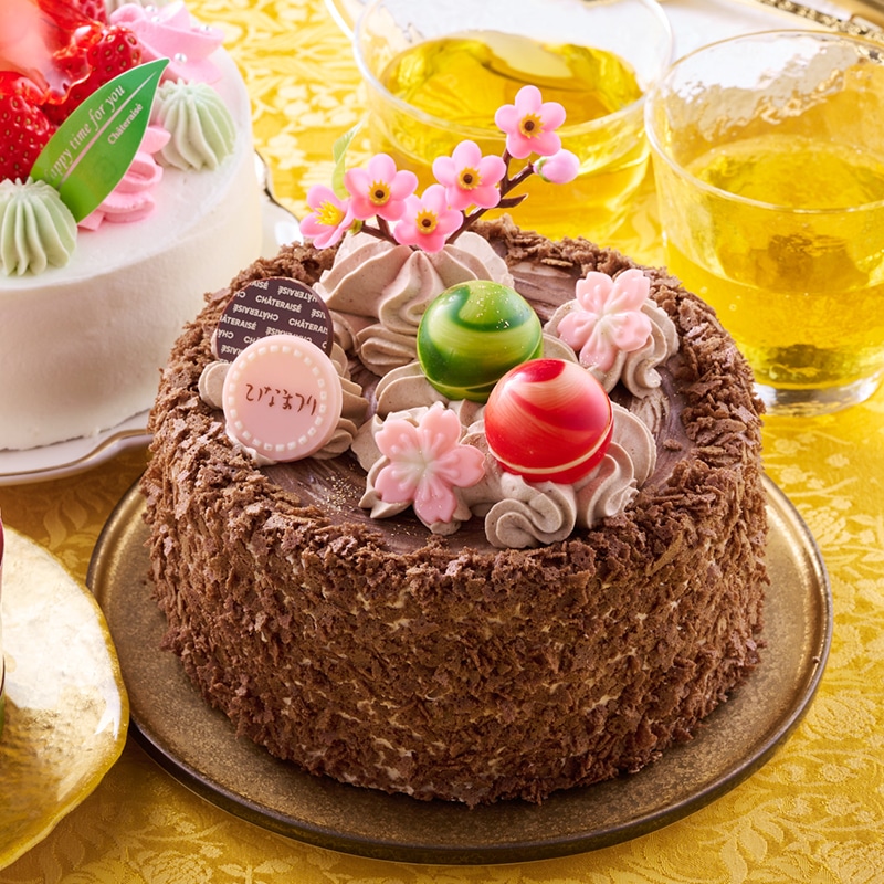 ひなまつりの雛壇をイメージして、チョコレートのお内裏様とお雛様、三人官女を飾った、色々なフレーバーを楽しみたい方にぴったりの華やかなアソートケーキです。