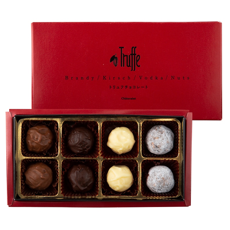 生クリームとバターをたっぷり使用し、口の中でとろけるチョコレートガナッシュに、ブランデー、キルシュ、ウォッカ、ナッツの4種の芳醇な香りが華を添えます。それぞれのトリュフが織りなす、贅沢なハーモニーをお楽しみください。